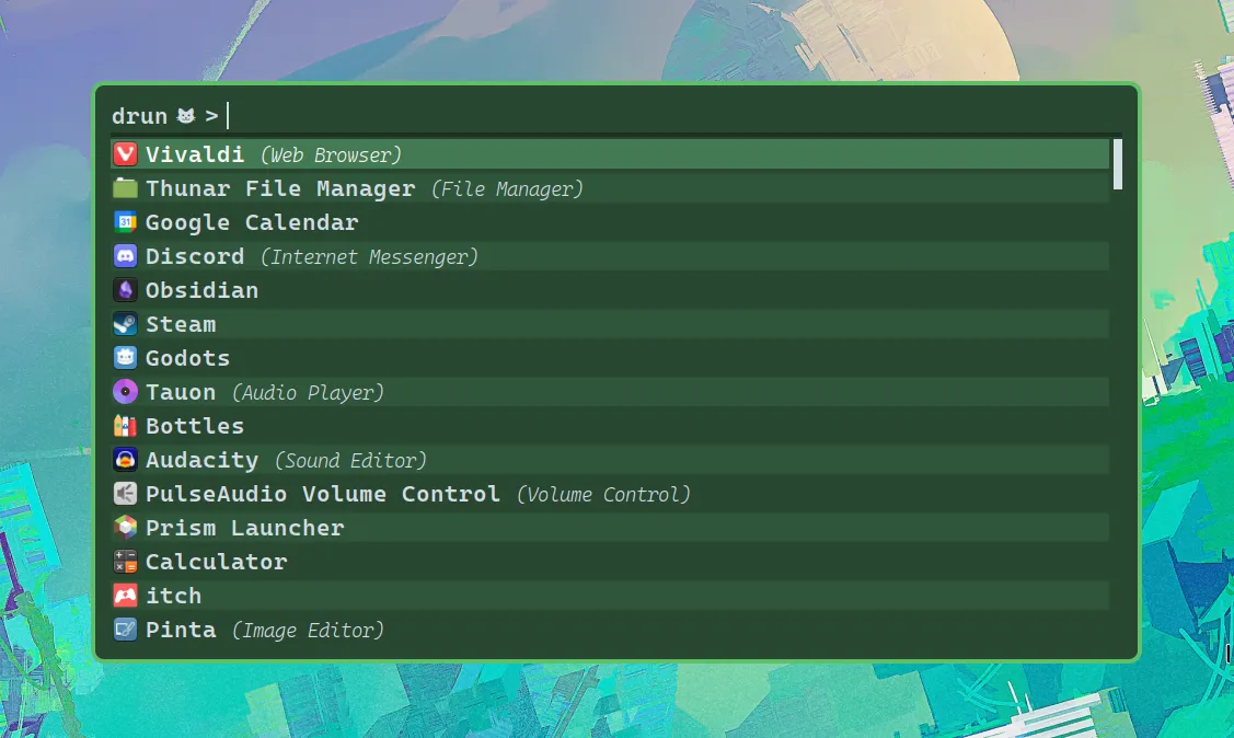 In order to launch programs, I use a tool called rofi and I have bound that program so that it runs when I press the "windows" key. It opens up a menu where I can search for programs and I have styled it to fit with the theming of the window manager.